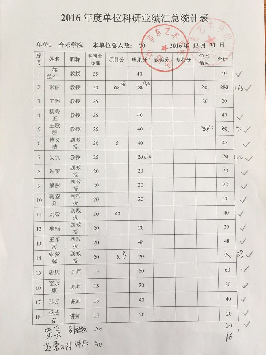 音乐学院2016年度科研业绩汇总统计表
