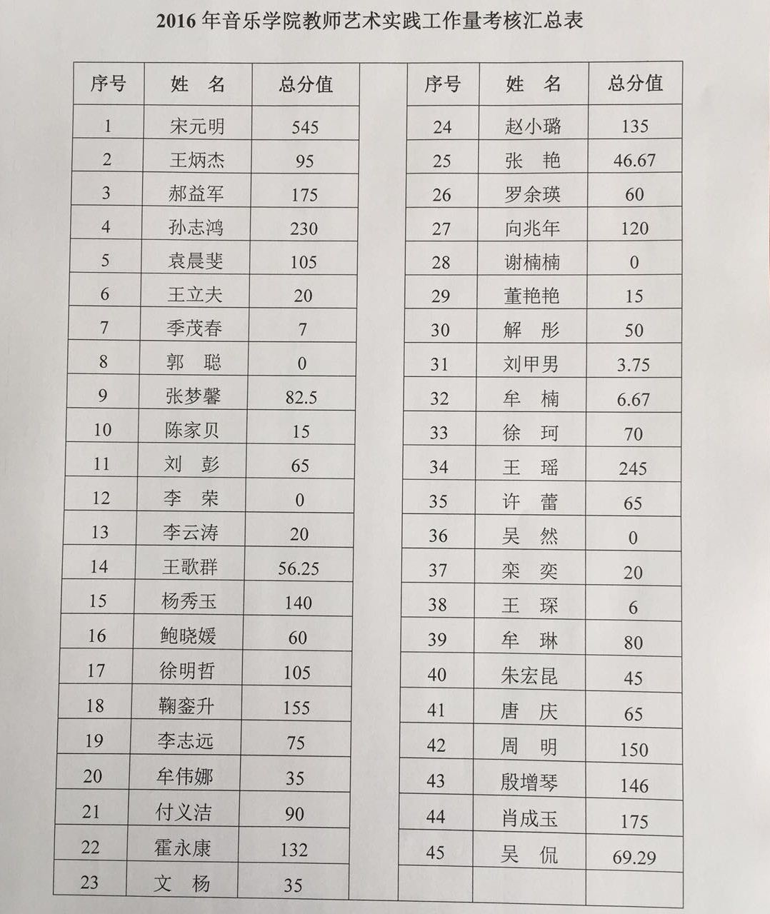 2016年音乐学院教师艺术实践工作量考核汇总表