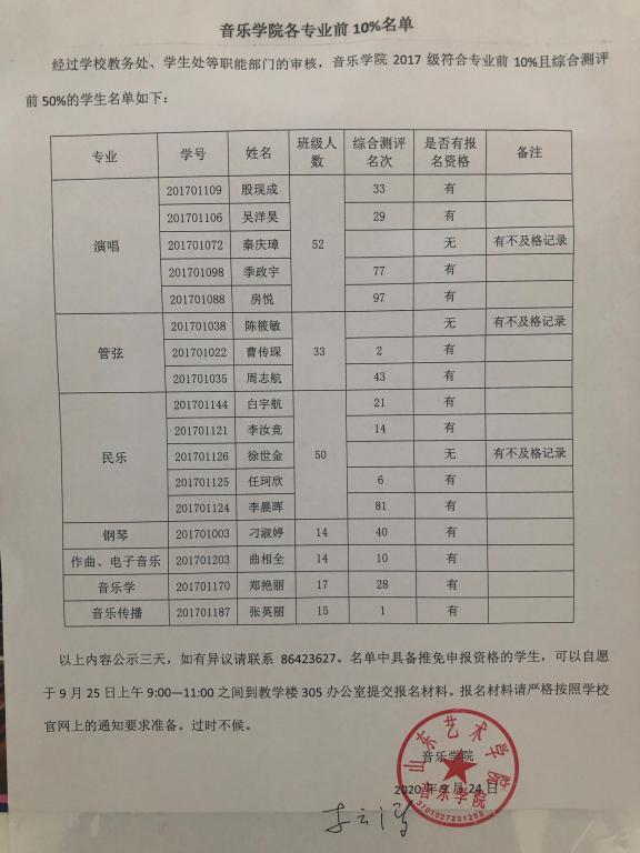 音乐学院2017级专业前10%名单公示