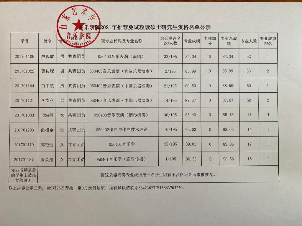 音乐学院2021年推荐免试攻读硕士研究生资格名单公示