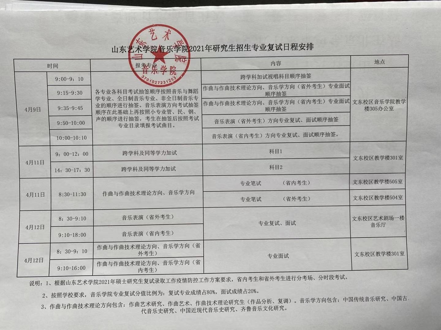 山东艺术学院音乐学院2021年研究生招生专业复试日程安排