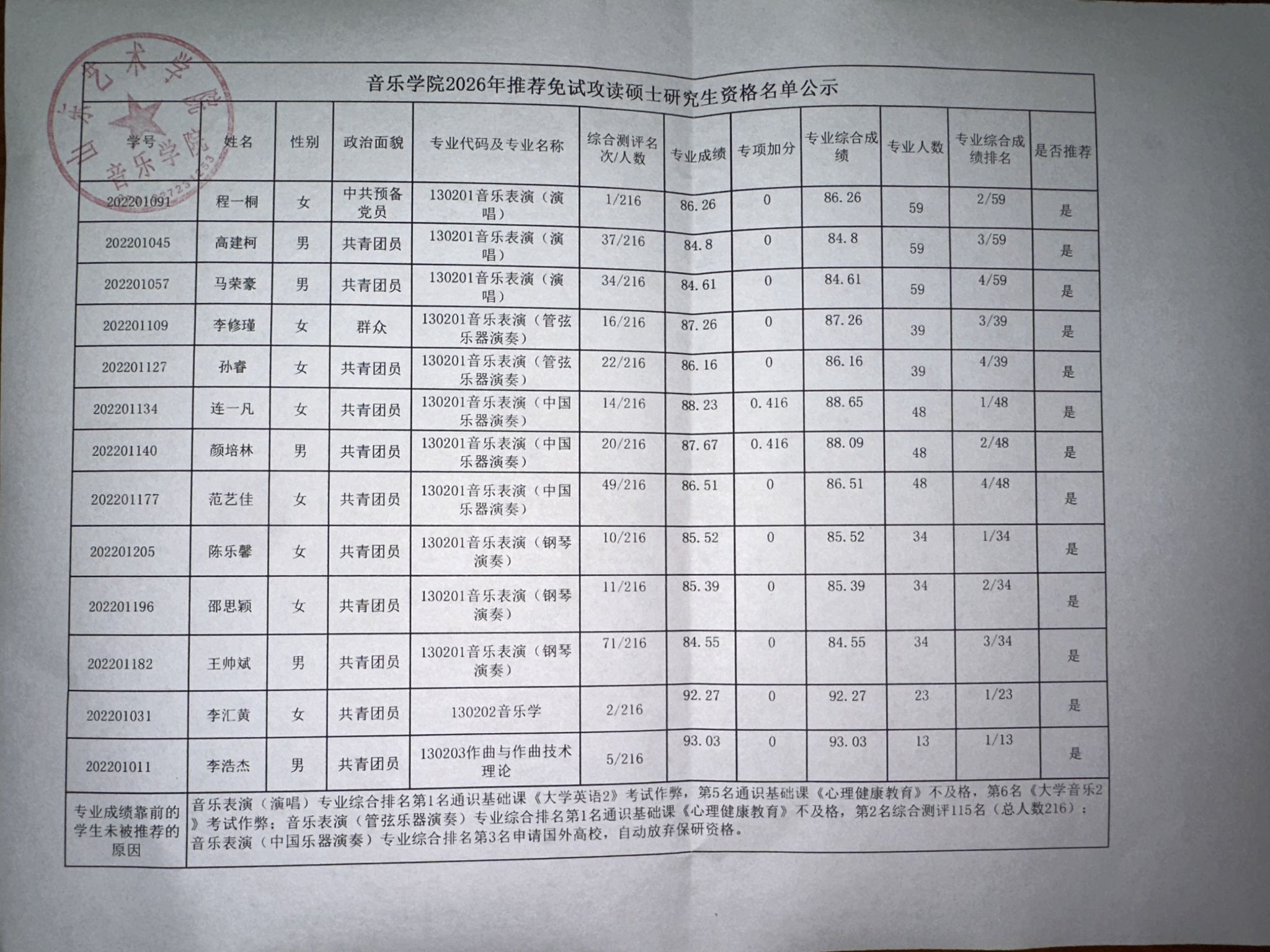 音乐学院2026年推荐免试攻读硕士研究生资格名单公示