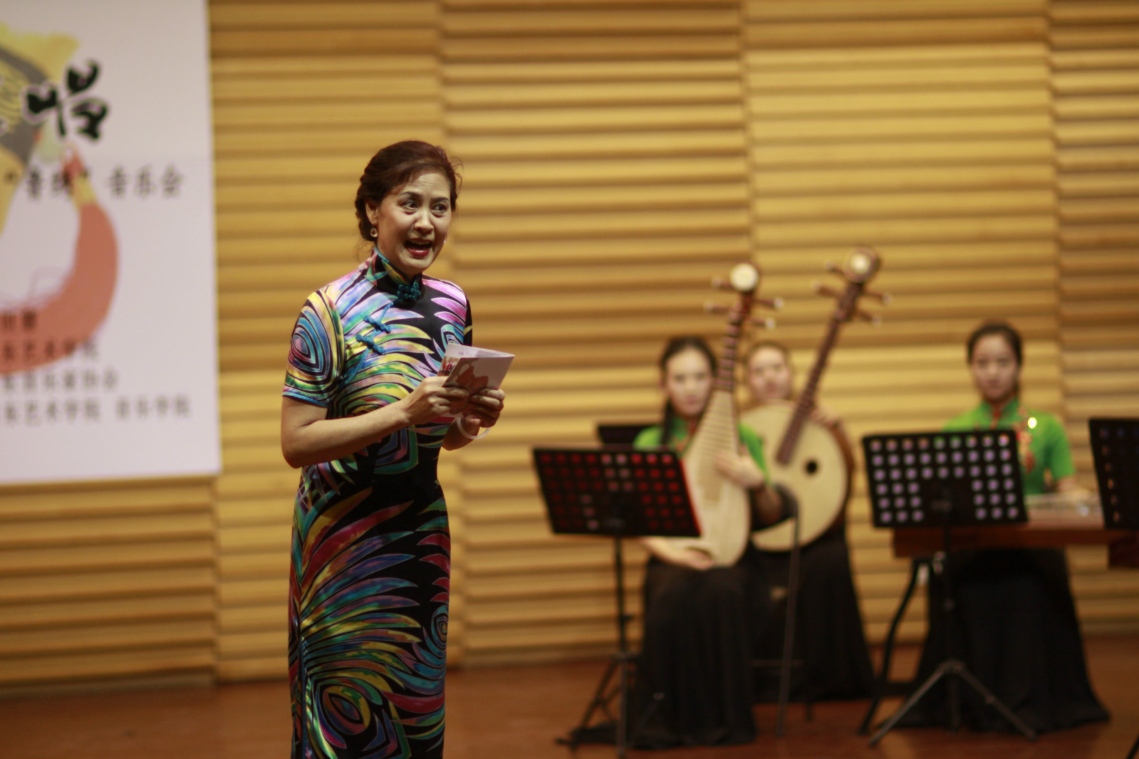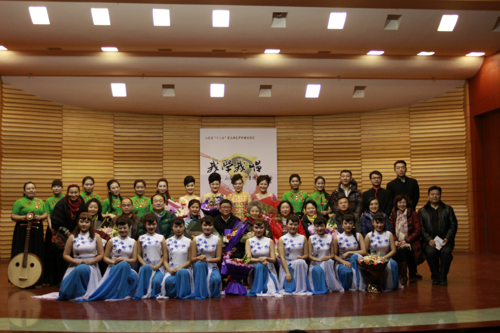 12月25日圣诞之夜,在山艺音乐厅举行了由山东艺术学院、山东省音乐家协会主办,山艺术学院音乐学院承办的,山东省“十二五”重点特色建设项目------王世慧指导的“我学我唱,山东民歌‘鲁绣’音乐会”。音乐会由小民乐队伴奏,以“绣”字为主题,共有绣荷包、绣花灯、绣针纹、绣鸳鸯、绣花针等二十余首好听的山东民歌。音乐会所有演唱人员都是王世慧教授所教过的学生。通过独唱、对唱、齐唱等表演形式展现给观众。全场曲目表现了同一个“绣”字不同地区不同的风格和韵味,令人耳目一新,赏心悦目。王世慧教授作为导聆,不仅为观众细致讲解这些民歌的文化背景,精彩之处做起示范,把民歌的原汁原味诠释的有声有色。姑娘们也用自己的所学所唱,细腻的刻画民歌形象。时而抒情委婉、时而高亢豪放、惟妙惟肖,恰到好处。最后把手中五颜六色的荷包抛向观众,再次把音乐会推向高潮。为观众送上具有中国情结、山东风味的圣诞大礼,视听盛宴。