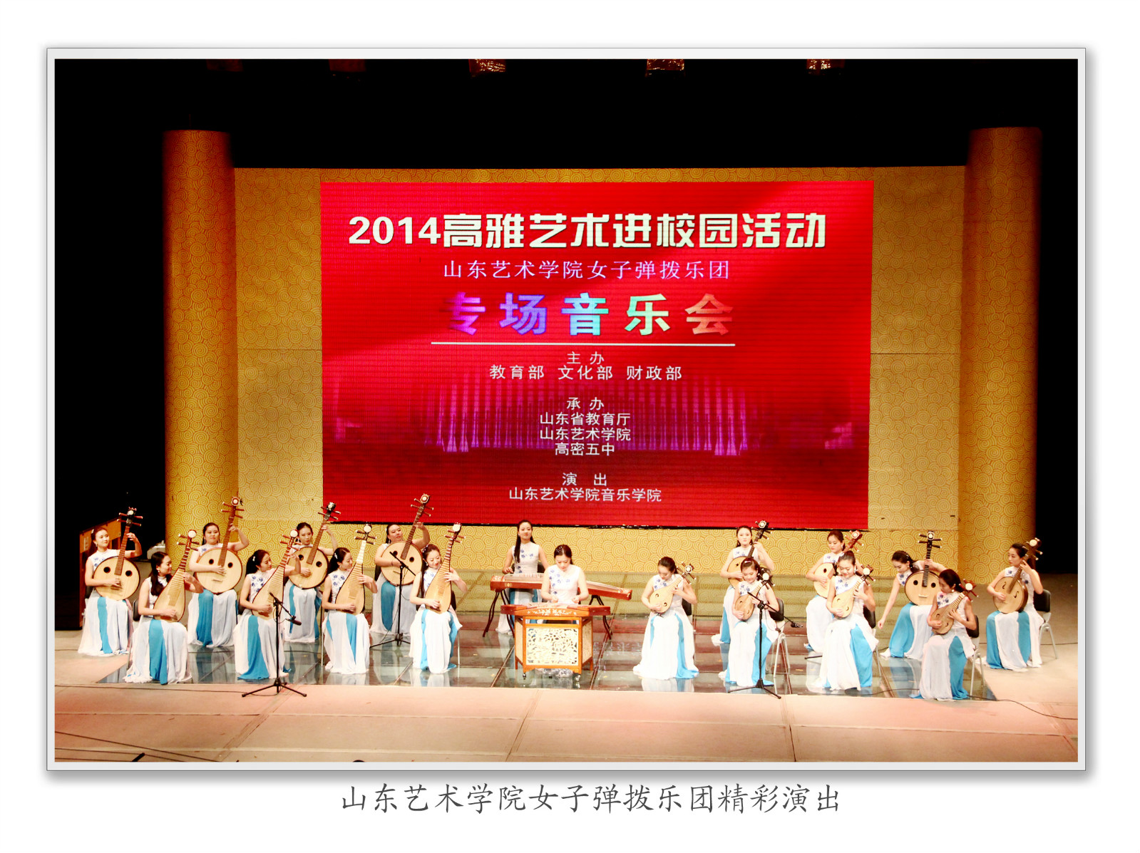 为进一步贯彻落实党的十八届四中全会精神,推进高雅艺术进校园活动,丰富校园文化生活,提高学生艺术修养,营造良好的文化环境,引领学生弘扬优秀民族文化。由教育部、文化部、财政部主办,山东省教育厅、山东艺术学院承办,我校音乐学院参加演出的高雅艺术进校园活动在高密、烟台拉开帷幕。