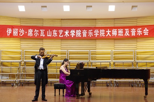 2014年10月12日,小提琴演奏家伊利沙·席尔瓦在国内各大院校大师班授课及巡演之旅来到了山东艺术学院。12日上午,伊利沙·席尔瓦在音乐厅进行了大师班授课,席尔瓦先生用生动形象的方式向音乐学院的先生传授了演奏技艺与解读作品的观念,比如演奏巴赫作品时应体现的和声性与结构性,演奏莫扎特作品时应充分表达歌剧般的人物形象。当天晚上19::30分席尔瓦先生在音乐厅举行了个人专场音乐会。音乐会以一首小提琴独奏《巴赫第三小提琴无伴奏组曲》拉开了序幕,悠扬婉转的小提琴声萦绕在耳边,让听众陷入无限遐想之中。接下来的钢琴三重奏《d小调第一钢琴三重奏》让大家欣赏了小提琴、大提琴、钢琴三种乐器融合的风采,令听众耳目一新。接下来的几曲华丽炫技的小提独奏让大家叹服于大师的精湛琴技,最后一曲《只差一步》以优美华丽的旋律让我们仿佛身临一场舞会,所有人都陶醉在优美的旋律中。