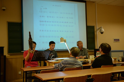 6月5日晚18:30,牟善平教授、牟楠副教授于上海音乐学院主楼教室进行授课。上海音乐学院著名竹笛演奏家詹永明教授主持了本次授课,著名的笙演奏家翁镇发教授、徐超铭教授和旅德笙演奏家、上海音乐学院特聘“东方学者”吴巍教授共同授课。现场聆听讲座的学生除了上海的笙专业学生,还有特地从韩国、福建、山西等各地赶来学习的同行。首先牟善平教授、牟楠副教授对所有到场的老师及同学表示感谢,继而进行了对“牟氏笙演奏风格”的全面分析讲解,其中独创的“舌颤”技巧和独到的“三大气”(顿气、锯气、剁气)的吹奏特点丰富了笙的演奏技法。牟楠副教授对独创作品进行了示范演奏。当晚的讲座盛况空前,很多老师学生都是为一睹大师风采慕名而来,牟善平教授耐心仔细,生动风趣的一一讲解了山东笙演奏技法和乐曲,毫无保留的传授给大家。牟楠副教授做了相当精彩的技巧演示,最后一曲《出水莲》让大家大饱耳福。