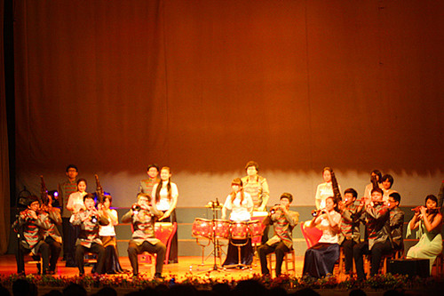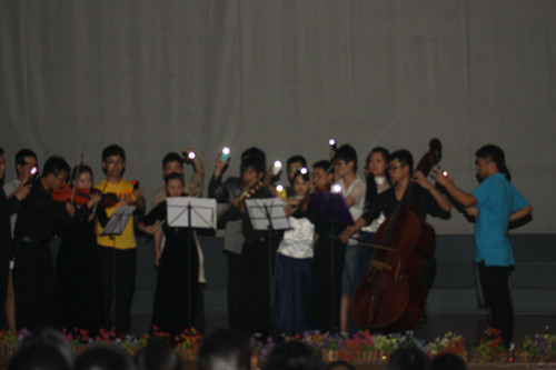 晚会在吹打乐《山乡情》激情悠扬的曲调中拉开帷幕,该作品是由山东艺术学院音乐学院郝益军教授作曲,我院民族乐团演奏,曾在山东大学生文艺汇演中获一等奖。接下来的女声独唱《红旗飘飘》,激情四射的演唱激发了每一个人的爱国情感。当晚会进行到弦乐重奏《宫崎骏原声音乐》时,现场突然发生断电事故,但感人的一幕出现了,我院杨晓飞等演奏者并没有因此停止演奏,在后台多名工作人员和演员手机电筒灯光的照耀下下坚持把优美的曲子演奏完整,显示了我院学生执着认真的演出态度,获得了台下观众的交口称赞,并在观众强烈的要求下又献上了另一首弦乐重奏曲目,场面和谐感人。情景剧《一个都不能死》,让我们回想起中国共产党领导中国人民英勇抗战的峥嵘岁月。为给现场维修人员赢得时间,我院张洪海和张强同学深情演唱了四首流行歌曲,带动了晚会的气氛,赢得台下阵阵欢呼。原创街舞《流星雨》,富有节奏感的音乐与王冠飞和倪英凯动感的舞姿融合在一起,为大家带来了一场精彩的舞台盛宴。新民乐演奏《赛马》带给了观众耳目一新的感觉。最后,晚会在男女声二重唱《举杯吧!朋友》欢快的歌声中结束了,现场气氛十分热烈。