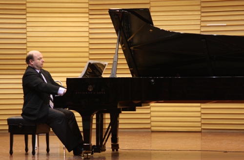 2008年10月16日14:00,在山东艺术学院文东校区艺术剧场一楼里我们迎来了校庆期间的第三场钢琴专场讲座。本次讲座由美国拿撒勒学院的詹姆斯教授主讲,他主要针对巴赫、贝多芬和莫扎特的作品与广大师生展开交流,从而使大家了解不同的音乐风格以及怎样理解作品并通过钢琴将其表达给听众等内容。接下来由我院戚斌同学演绎了巴赫的作品,在他如火纯情的演奏后,詹姆斯教授向大家讲解了巴赫的音乐特点,看似无形却有形,在没有任何故事背景下,演奏者要编织整体故事并完整的表达出来。