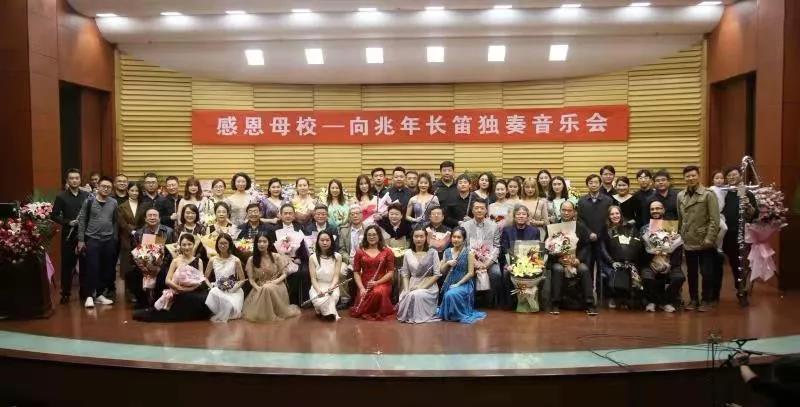 本场音乐会由山东艺术学院教授彭丽博士担任导聆,音乐学院钢琴系主任王瑶教授和向艺茹分别担任钢琴伴奏。音乐会现场热烈而火爆,向兆年为大家演奏了不同时期、风格各异的8首长笛代表性作品,分别为《f小调奏鸣曲》《守候》《秋之韵》《连斯基的咏叹调》《懊悔与决心》《多愁善感》《小夜曲》《奏鸣曲》。他的演奏富有艺术表现力,风格把握精准,时而细腻柔婉,时而激情四射,带给现场观众难得的艺术和互动体验。音乐会最后,向兆年和他来自全国各地的学生代表30余人共同演奏了《难忘今宵》,并纷纷表达对母校对恩师的感激之情:“闳约深美育桃李,笛声悠扬念师恩。”“闳约深美,青春无悔。最美山艺,国内一流。”“感恩母校,难忘今宵;祝福母校,申博成功。”此情此景,强烈的音乐感染力和感人场景,令现场观众深深感动并报以经久不息的掌声。