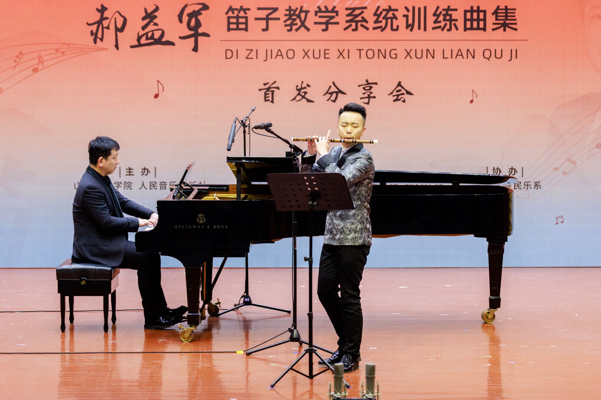 分享会上,郝益军教授分别与我院钢琴博士刘路遥、及来自青岛的“八骏室内乐团”合作演奏了新教材中三首作品《天水》《泉》《夸山东》,郝益军教授以其独特的音乐风格和精湛的演奏技艺,为观众带来了一场视听盛宴,将分享会的氛围推向了高潮。