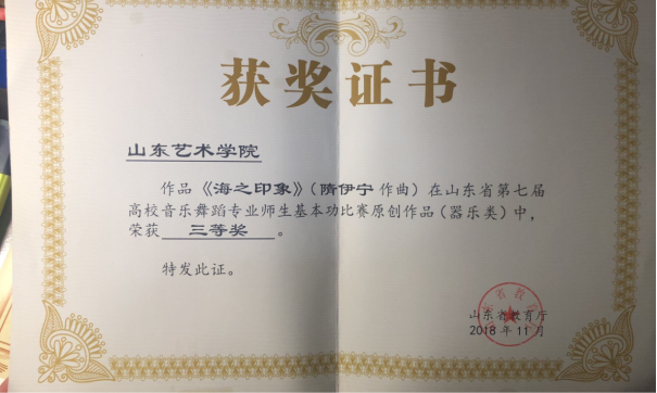 《海之印象》获山东省第七届高校音乐舞蹈专业师生基本功比赛音乐类原创作品(器乐类)三等奖