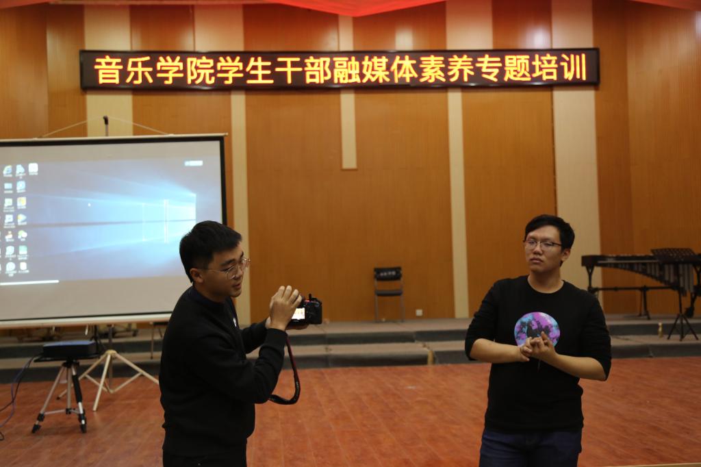 12月14日下午,音乐学院学生干部融媒体素养专题培训在演播厅举行。专题培训邀请传媒学院2017级数字媒体艺术专业任浩铭、马乾程同学主讲。音乐学院院党总支副书记王志军、辅导员王维海和学生会、演出运营中心学生干部参加培训。