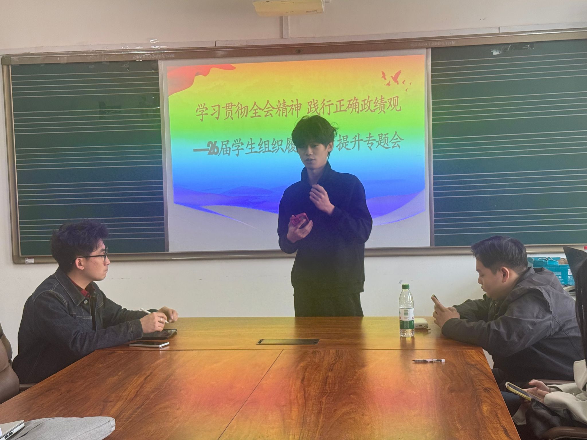为深入学习贯彻二十届四中全会精神,引导学生干部树立和践行正确政绩观,切实提升服务同学的能力与水平,近日,我院学生组织召开专题工作会议,全体主席团部长团参会。