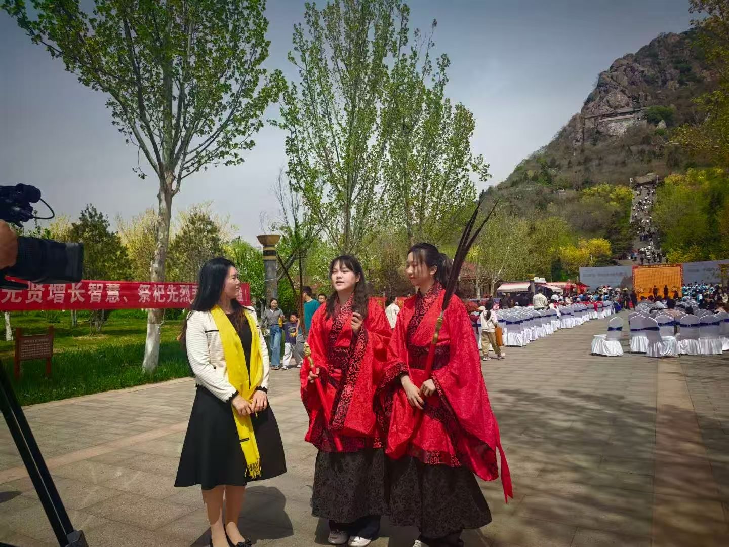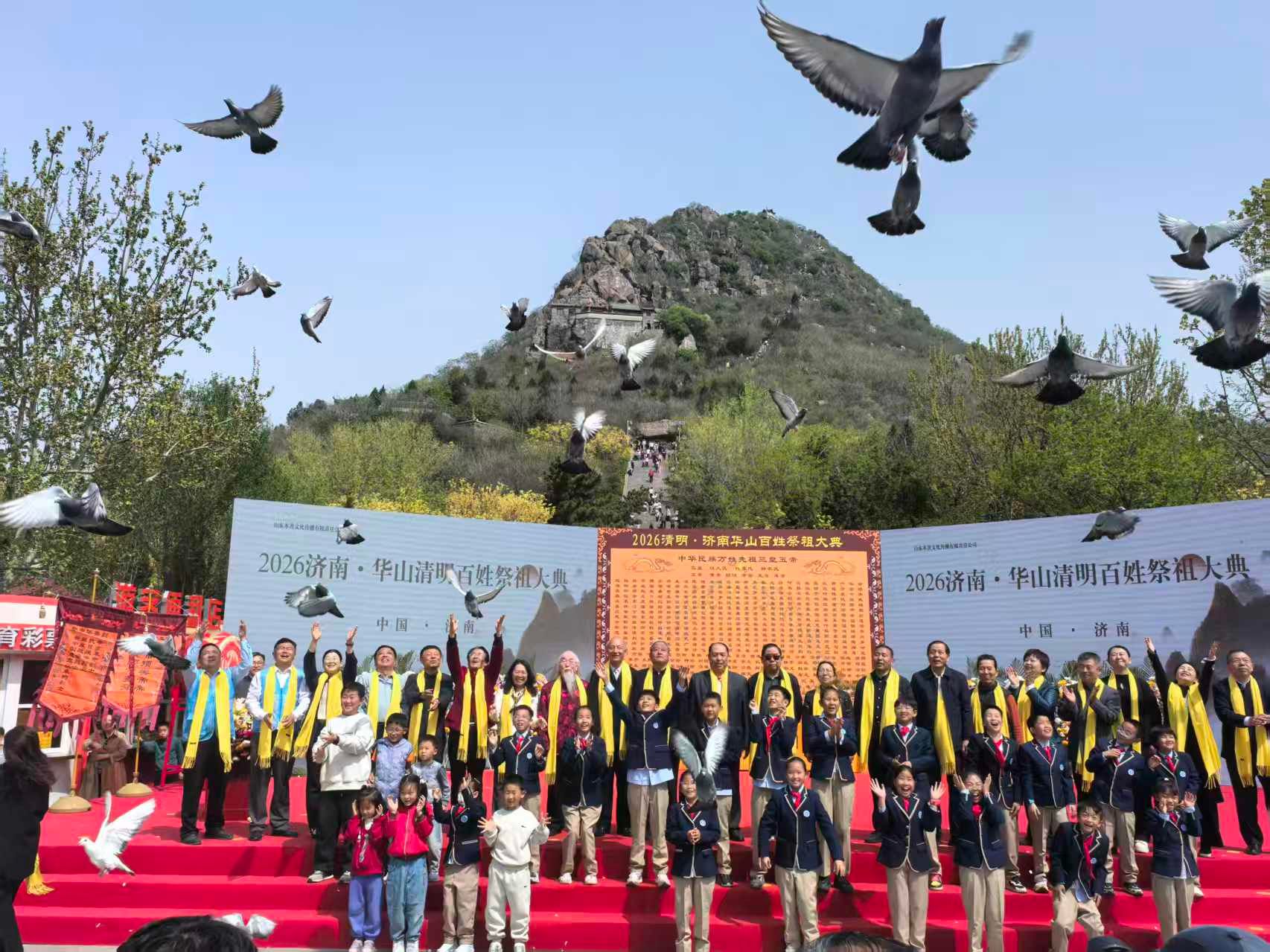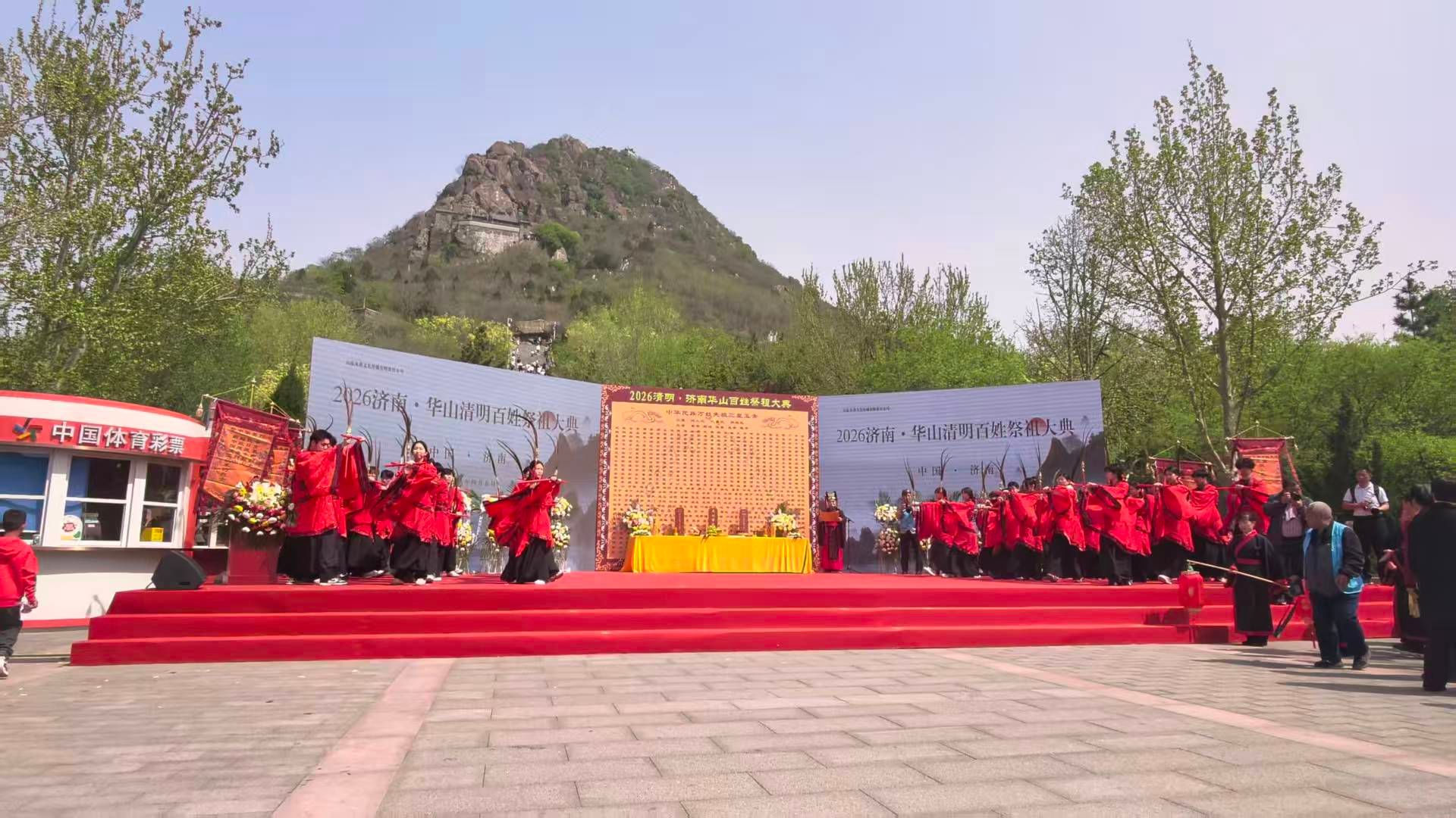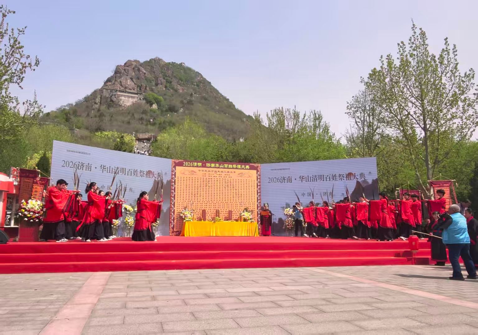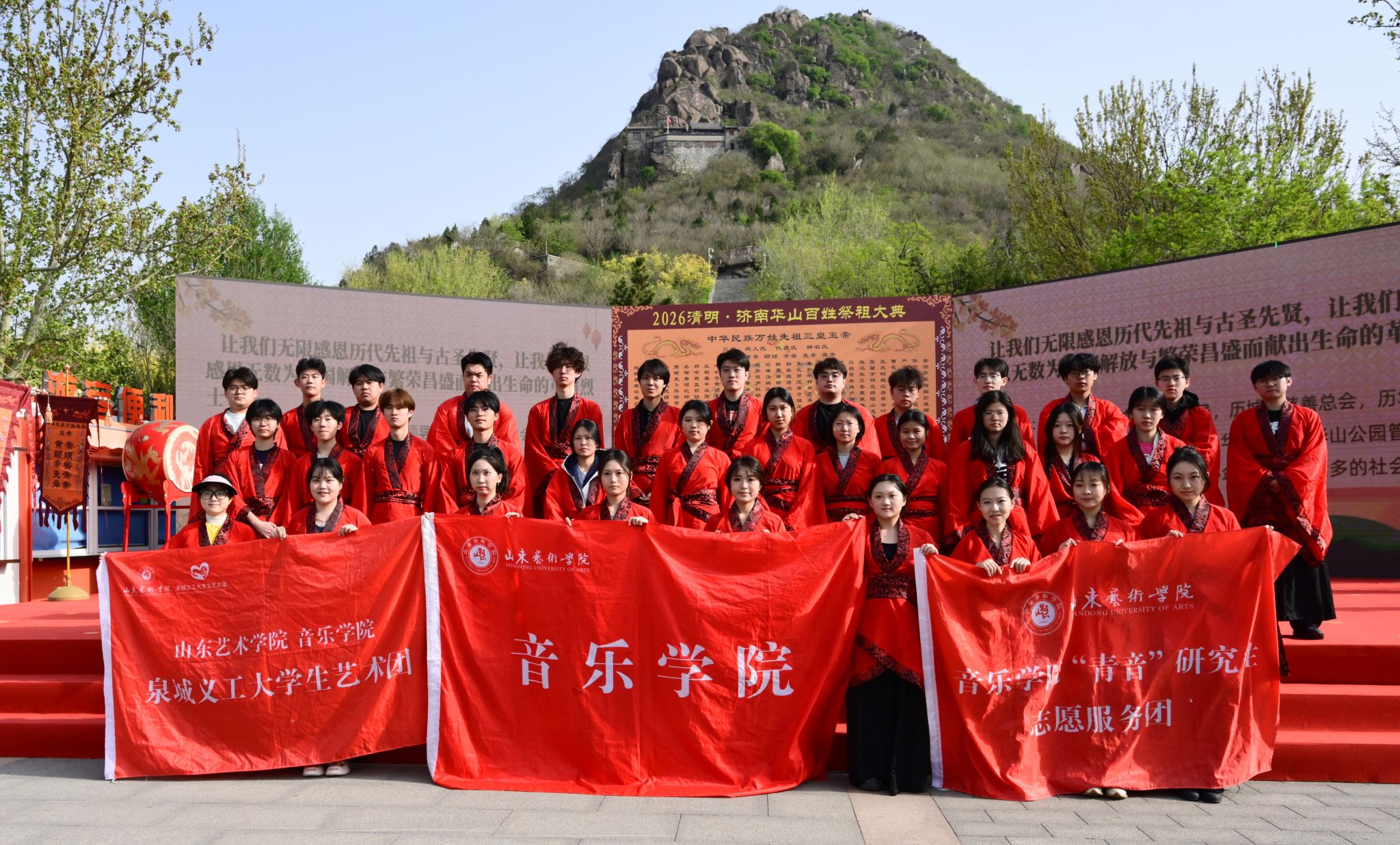 4月5日上午,2026济南·华山清明百姓祭祖大典在华山公园鹊华秋色广场举行。山东艺术学院音乐学院学子受邀参加活动,以国家级非物质文化遗产——佾舞这一礼乐文化形式,缅怀先烈、追思先贤、感念先祖,感念先祖,同步开展敬祖、承德、向善家风传承“青廉课堂”教育活动。